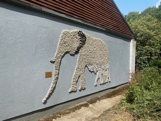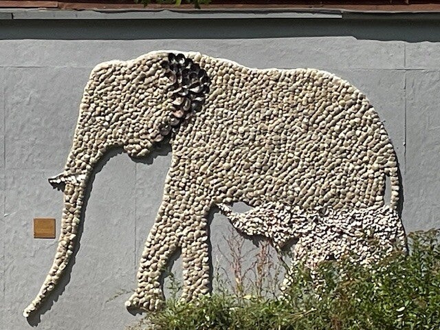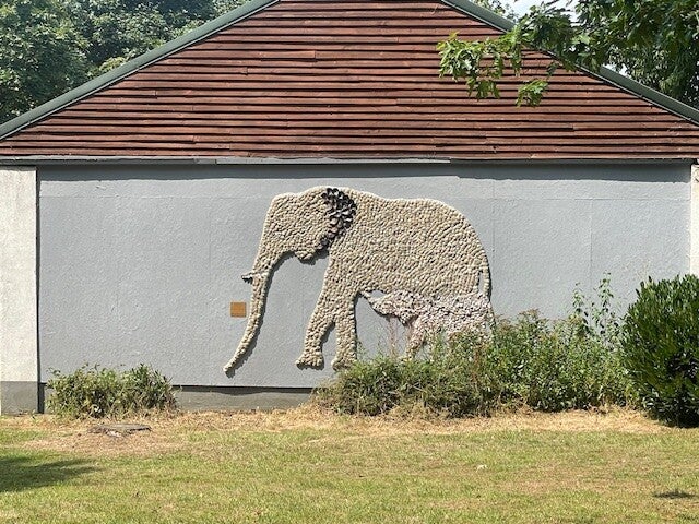 this mix of sculpture and mosaic of shells depicts the mother and child elephant crossing the old viewing end of the elephant house.